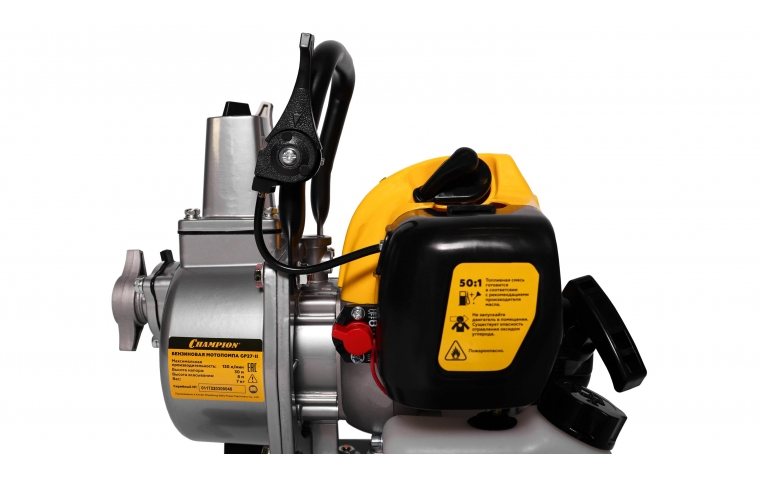 Мотопомпа CHAMPION GP27-II - агрегат для перекачивания и подачи воды на хозяйственные участки и сады, откачки воды из колодцев или подвалов. Оснащена одноцилиндровым 2-тактным двигателем мощностью 1.22 л.с., который работает на смеси бензин/масло. Наличие топливного насоса обеспечивает легкий и быстрый запуск мотора. Агрегат установлен на прочную раму из металла для устойчивости на любой поверхности. Вес - всего 7 кг. В конструкции предусмотрена рукоятка для транспортировки мотопомпы.