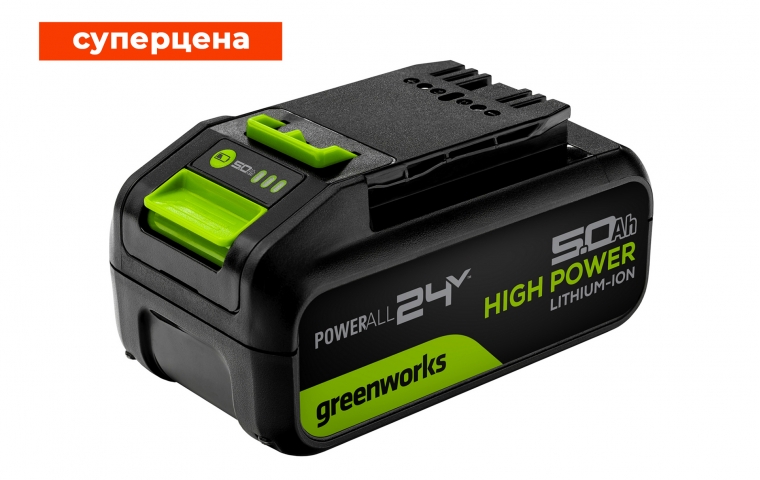 G24HP5 — универсальный аккумулятор емкостью 5 Ач, подходящий для всех инструментов платформы Greenworks POWERALL 24В.