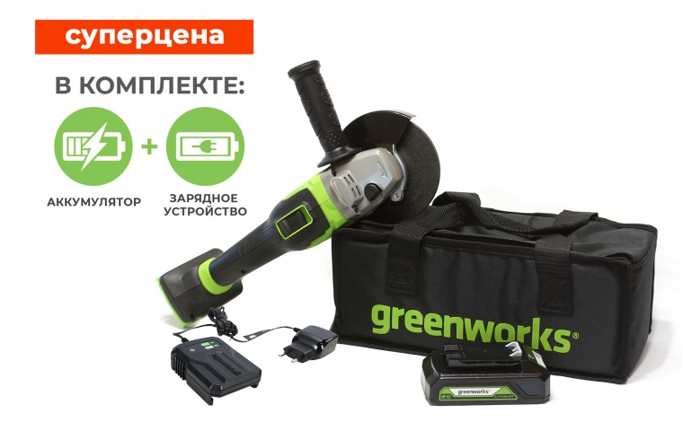 Углошлифовальная машина Greenworks GD24AGK2 24В (в комплекте АКБ 2А/ч + ЗУ)