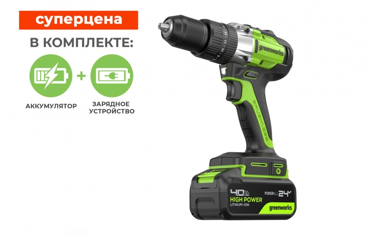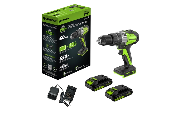 Аккумуляторная дрель-шуруповерт Greenworks GD24DD60 24В (в комплект АКБ 2А/ч х 2 + ЗУ)