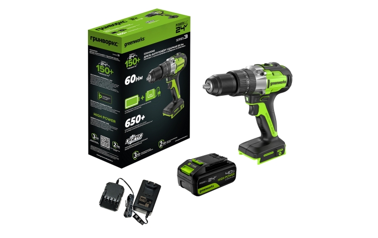 Аккумуляторная дрель-шуруповерт Greenworks GD24DD60 24В (в комплект АКБ 4А/ч + ЗУ)