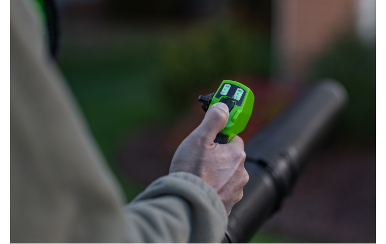 Воздуходувка имеет турбо режим и круиз контроль для оптимальной работы в различных задачах. Турбо режим подходит для наиболее интенсивной уборки, а круиз контроль — для стабильной скорости на средних оборотах.
