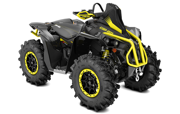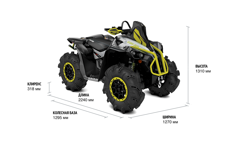 Колеса квадроцикла также максимально подготовлены к суровому бездорожью. Имея дисковые тормоза размером в 21,4 см и усиленные гидравликой, они оснащены высокими и частыми грунтозацепами. В сочетании с полноприводной системой и качественным распределением веса корпуса на большие колеса, квадроцикл BRP 2017 RENEGADE 1000R X MR способен уверенно и быстро перемещаться как по прямой, так и под большим углом наклона. Стоит отметить, что вес этого спортивного аппарата составляет 314 кг. При этом мотовездеход имеет высокий дорожный просвет в 26,7 см, что также обеспечивает немалый комфорт при езде.